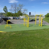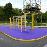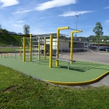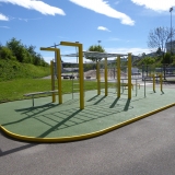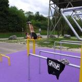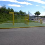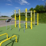 A street workout park is normally installed on a field. First, we create concrete foundations in order to anchor the poles into the ground. Frost-protection gravel forms the basis of the fall-protection area. We then pour a 10 cm thick layer of permeable concrete over it. Subsequently the fall protection made of EPDM rubber granulate is glued on. The fall protection lies on the same level as the surrounding grass. Nowadays street workout parks can be anchored to an existing asphalt surface by using special asphalt screws. The benefits of this solution: If necessary, the entire park can easily be dismantled and moved to a different location. The frost-protection layer is not needed, since the asphalt surface already has a frost-free foundation. A galvanized steel frame, which is powder-coated in the RAL colour of your choice, is used for the edging.