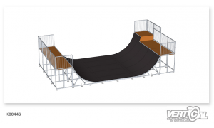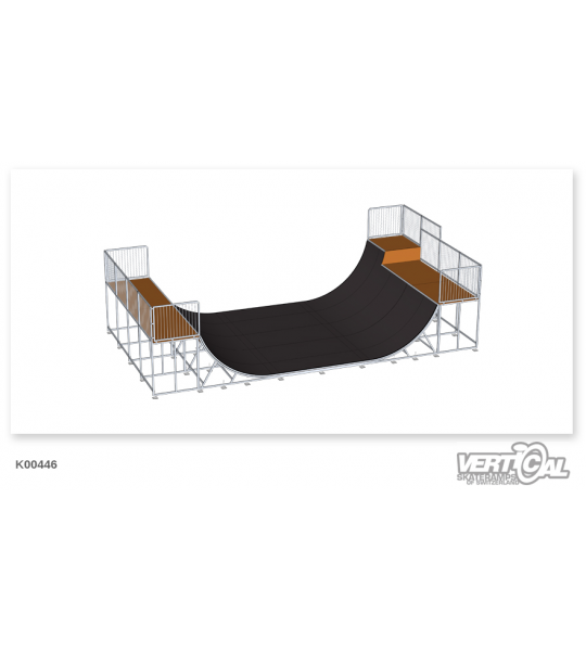 A miniramp is a skateboard facility with a horizontal flat bottom, with two rounded walls (one on each side of the flat), with coping and platforms on each side. This module is utilized for back-and-forth skateboarding and for tricks such as grinds, airs, kickflips or tailslides on the coping. This product is compatible with K00314 and K00457.