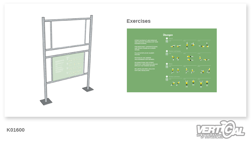 This info panel in A1 format fits the INOX chrome steel holder with article number K01559. The holder can accommodate two info panels in A1 format. The second panel can be used for additional information, for example, to list exercises with QR codes for street workout facilities.