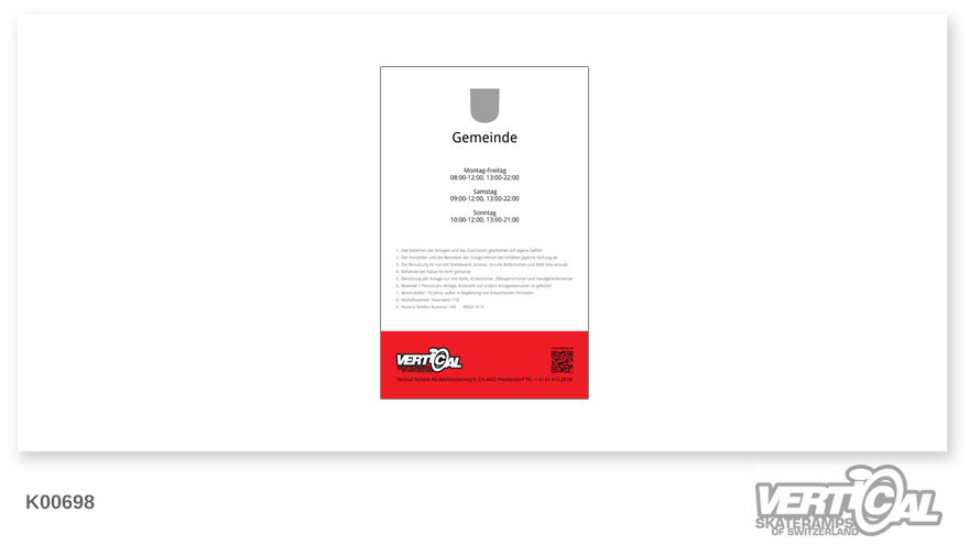 For the operation of a parkour facility, we recommend an information board according to EN 16899, displaying emergency numbers, rules of conduct, opening hours, and contact information. The information board will be graphically customized by us according to customer requirements. One design draft is included in the price. Additional work exceeding the first draft will be charged based on effort at an hourly rate of 125 CHF. The board includes the following information: