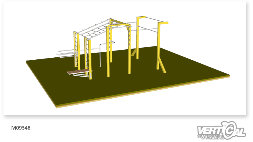 This street workout park offers training options for Ninja, street workout, and fitness. Ninja enthusiasts appreciate the “ring toss” (climbing along a steep pole with balls), street workout fans use most of the elements, and fitness-focused users will use the bench to train the abs and back. The classic dip bars are for everyone. Last but not least, the real highlight is the sky ladder, where You lock in upwards with a bar. Bottom line: this setup is packed with options in a small space.