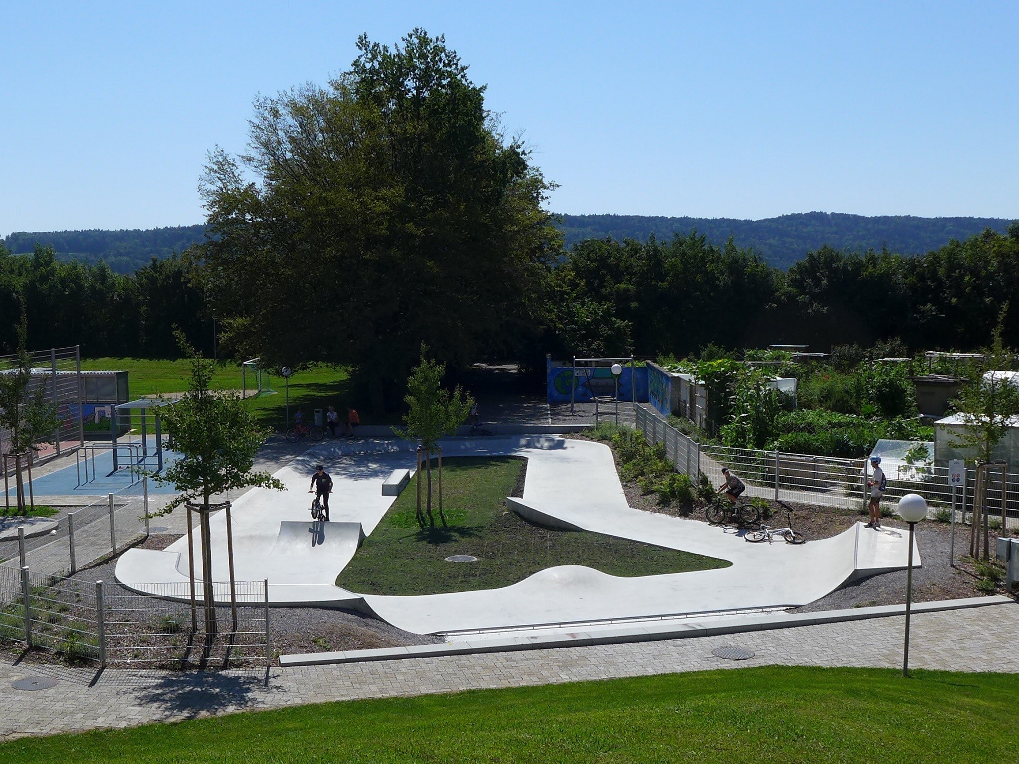 Description du skatepark : Flowpark avec virage bas à pic, vague, spine, quarterpipe, bowl corner avec deux hips, curb, taco, wobble. Des bancs en béton ont été installés aux extrémités du skatepark. La zone des spectateurs est délimitée par un tube en acier. Le skatepark a été intégré dans le paysage de telle sorte qu’aucune partie de l’installation ne dépasse du sol.