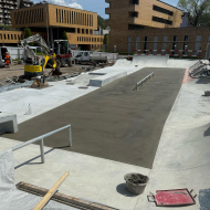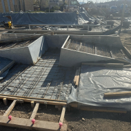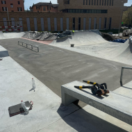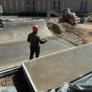 Der neue Betonskatepark bietet vielfältige Elemente für alle Levels. Eine breite Minirampe schließt direkt an den Street-Bereich an, in dem eine China Bank mit rotem Backsteinmuster steht, die beim Überfahren das typische „Rattern“ erzeugt. In den Ledges ist hochwertiger Granit verbaut, ergänzt durch ein Rundrail, Banks und Transitions im modernen Flowpark-Stil. Eine zusätzliche Extension ermöglicht es, Anlauf für Tricks zu holen.